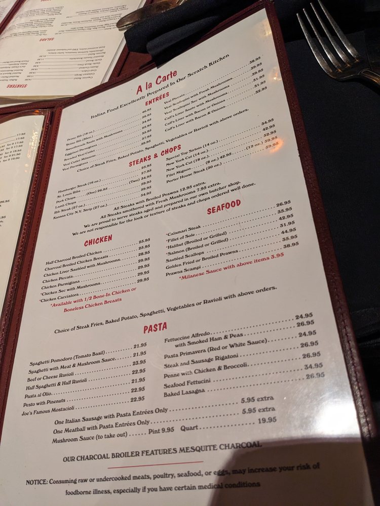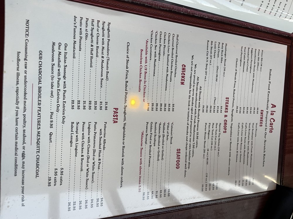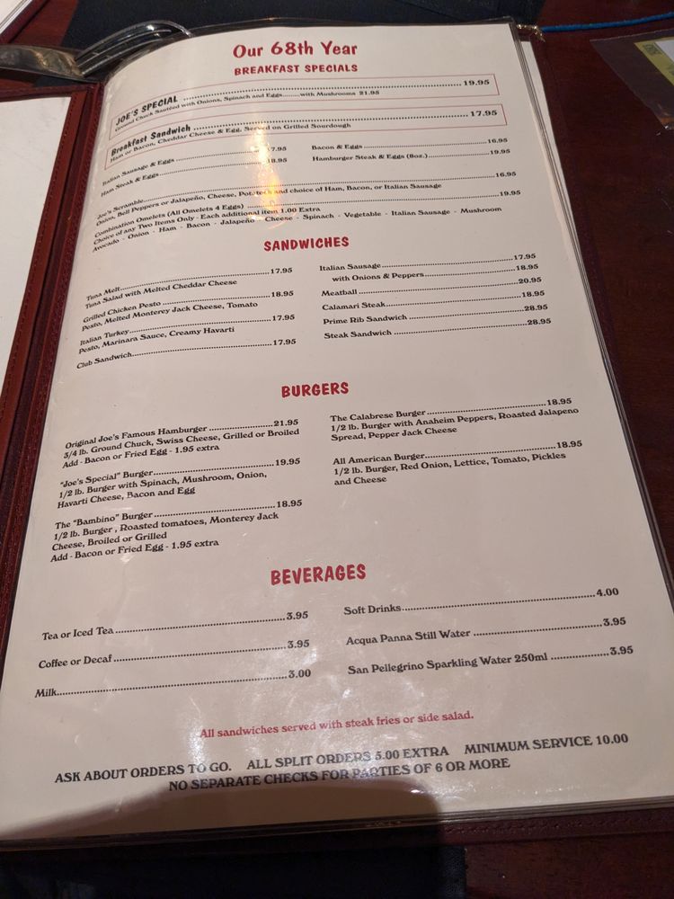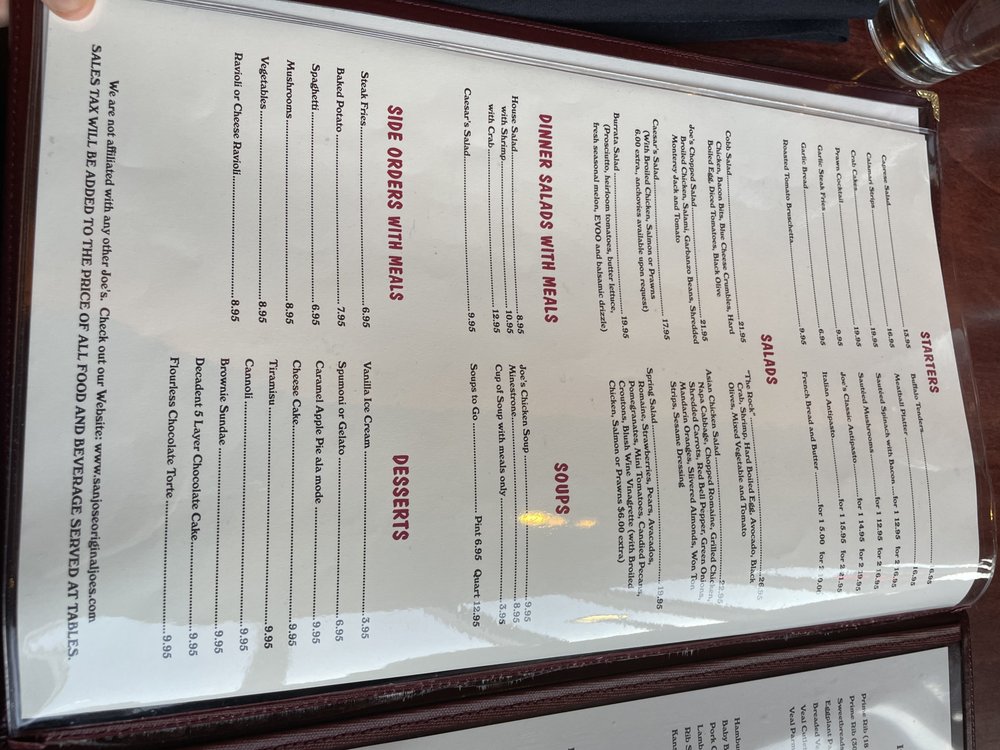 ASK ABOUT ORDERS TO GO. ALL SPLIT ORDERS $5.00 EXTRA MINIMUM SERVICE $10.00NO SEPARATE CHECKS FOR PARTIES OF 6 OR MORESALES TAX WILL BE ADDED TO THE PRICE OF ALL FOOD AND BEVERAGE SERVED AT TABLESConsuming raw or undercooked meats, poultry, seafood, or eggs, may increase your risk offoodborne illness, especially if you have certain medical conditionsWe are not affiliated with any other Joe-s.